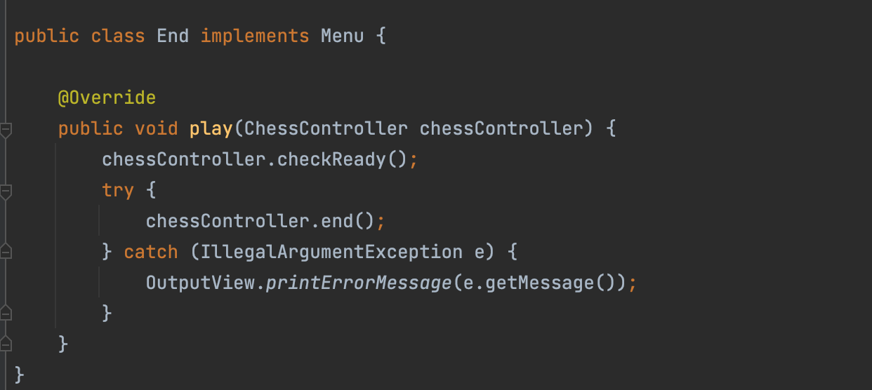 인터페이스에 명시 되어있는 play 라는 메서드를 오버라이딩 하여 게임을 종료시킨다.