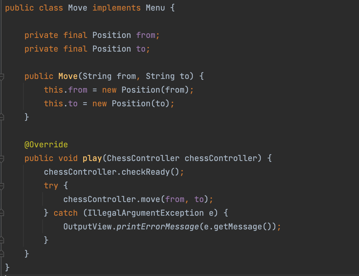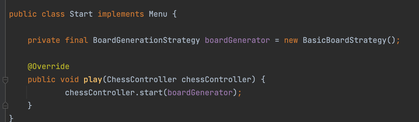 인터페이스에 명시 되어있는 play 라는 메서드를 오버라이딩 하여 보드 위에 말을 이동하는 로직을 구현한다.